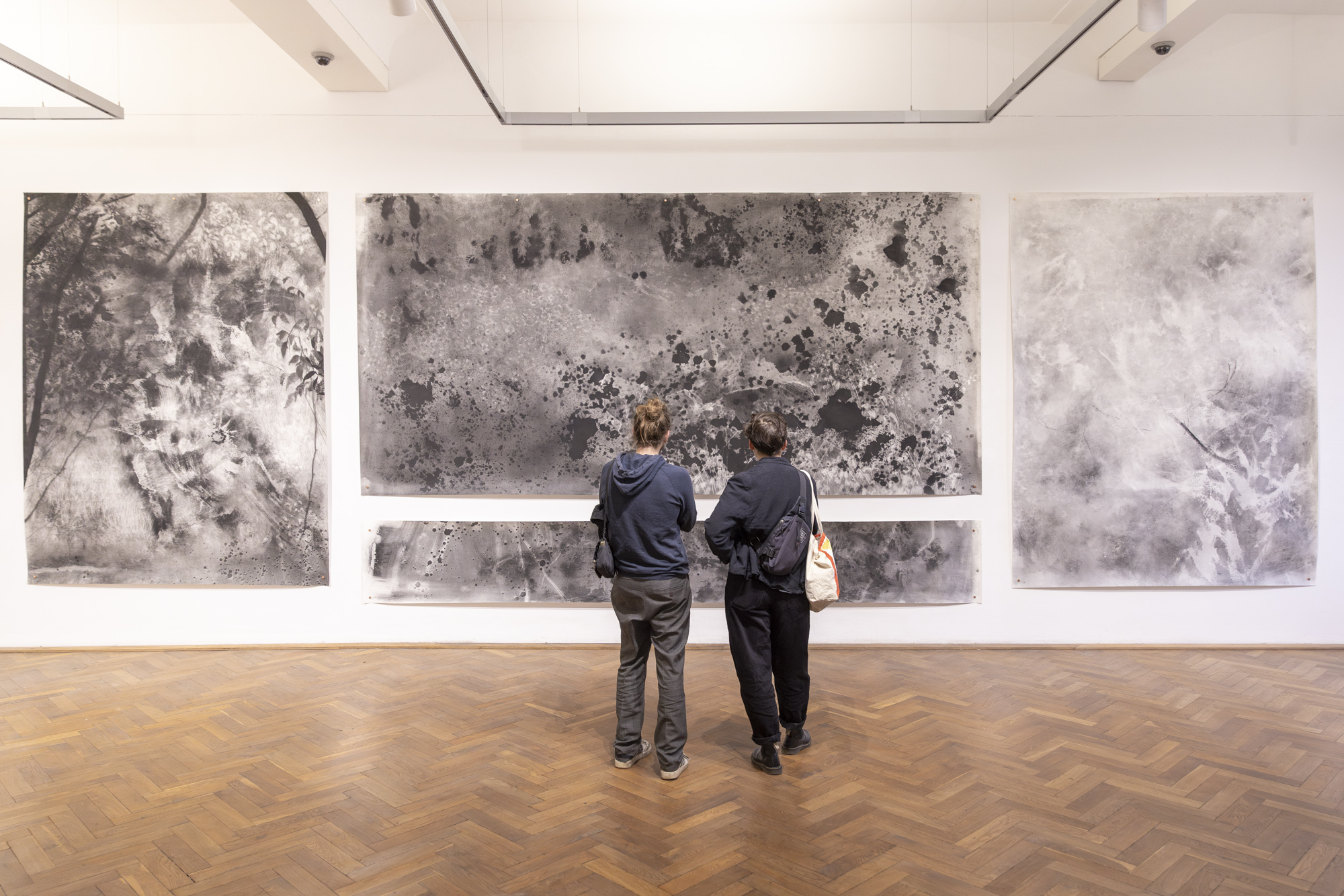Gesamtmaße 370 × 960 cm (drei großformatige Kohlezeichnungen auf Papier + Predella) / total dimensions 370 × 960 cm (three large-format charcoal drawings on paper + predella)